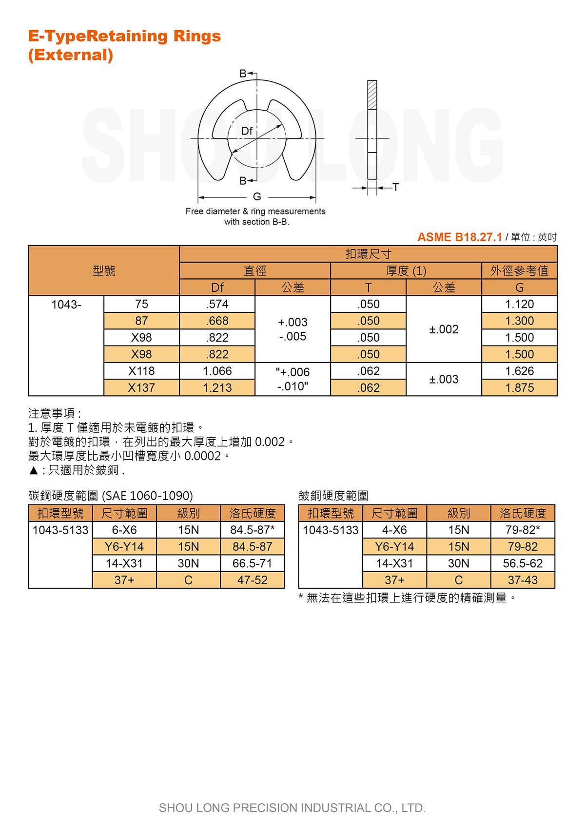 碩隆精密工業股份有限公司是台湾一家拥有超过40年经验的专业E型轴用扣环ASME/ANSI B18.27.1 (英制)生产制造服务商。我们成立于西元1991年, 在汽机车扣件产业领域上,碩隆提供专业高品质的E型轴用扣环ASME/ANSI B18.27.1 (英制)制造服务,碩隆总是可以达成客户各种品质要求。